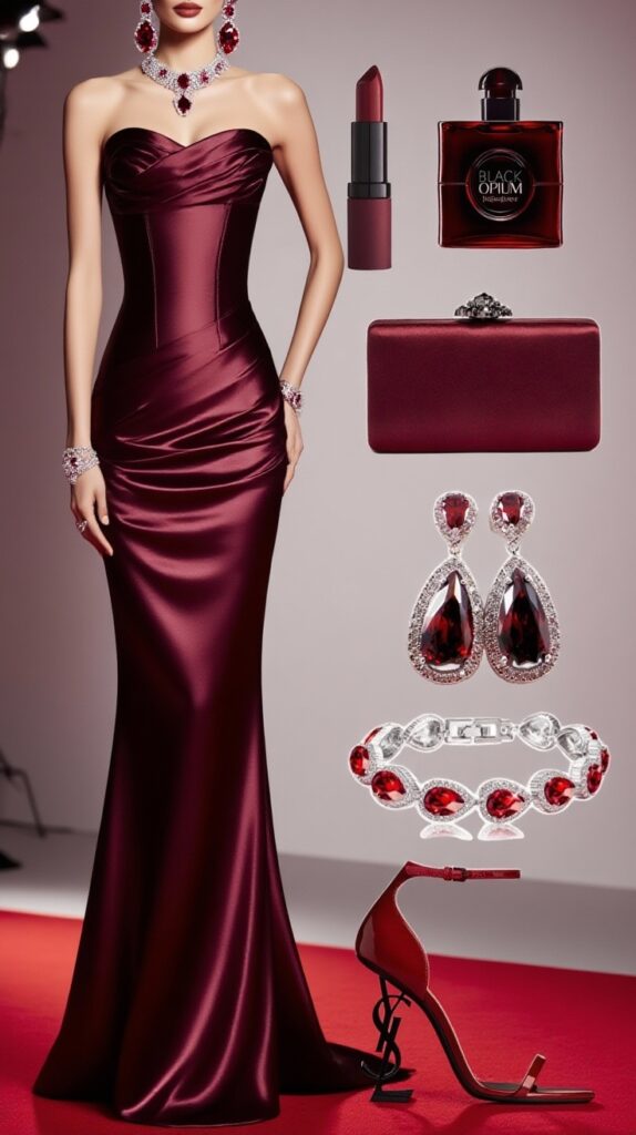 Model, lüks ve derin bir şarap kırmızısı (burgundy) renkte, vücudu saran, straplez korse üst kısma ve belden başlayıp yana doğru dökülen uzun, asimetrik bir kuyruğa sahip bir elbise giyiyor. Kıyafetin kumaşı parlak ve ipeksi (saten/ipek). Görünümü, iri ve gösterişli yakut kırmızı (ruby red) taşlı takılar (küpe, kolye, bileklik) ve aynı tonlarda bir el çantası ile tamamlanmış. Modelin duruşu kendinden emin ve güçlü, kırmızı halıda poz veriyor